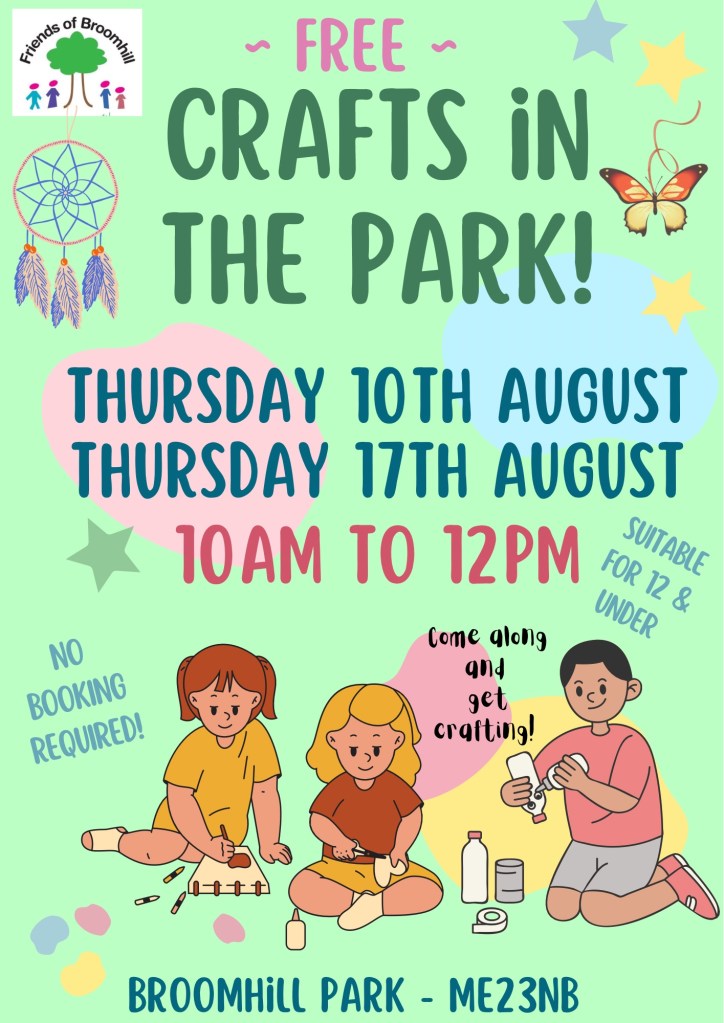 Free Crafts in the Park (suitable for 12yrs and under) on Thursday 17th August 10am – 12pm in the Old Orchard, Broomhill Park.